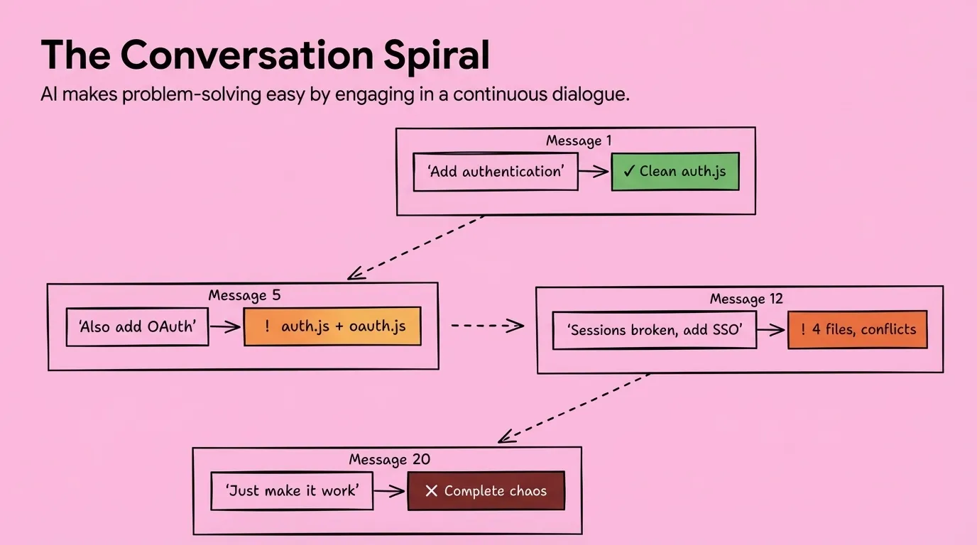 Horthy’s prescription was specific: “Build your entire plan around context workflow. Keep the context under 40%.” He introduced the concept of “intentional compaction”—compressing context down to focused markdown files that contain exactly what the AI needs to know, nothing more. When you see the AI responding “you’re absolutely right,” that’s your red flag. “It’s time to start over,” Horthy warned. The model is agreeing because it has lost the thread, not because you’re correct.