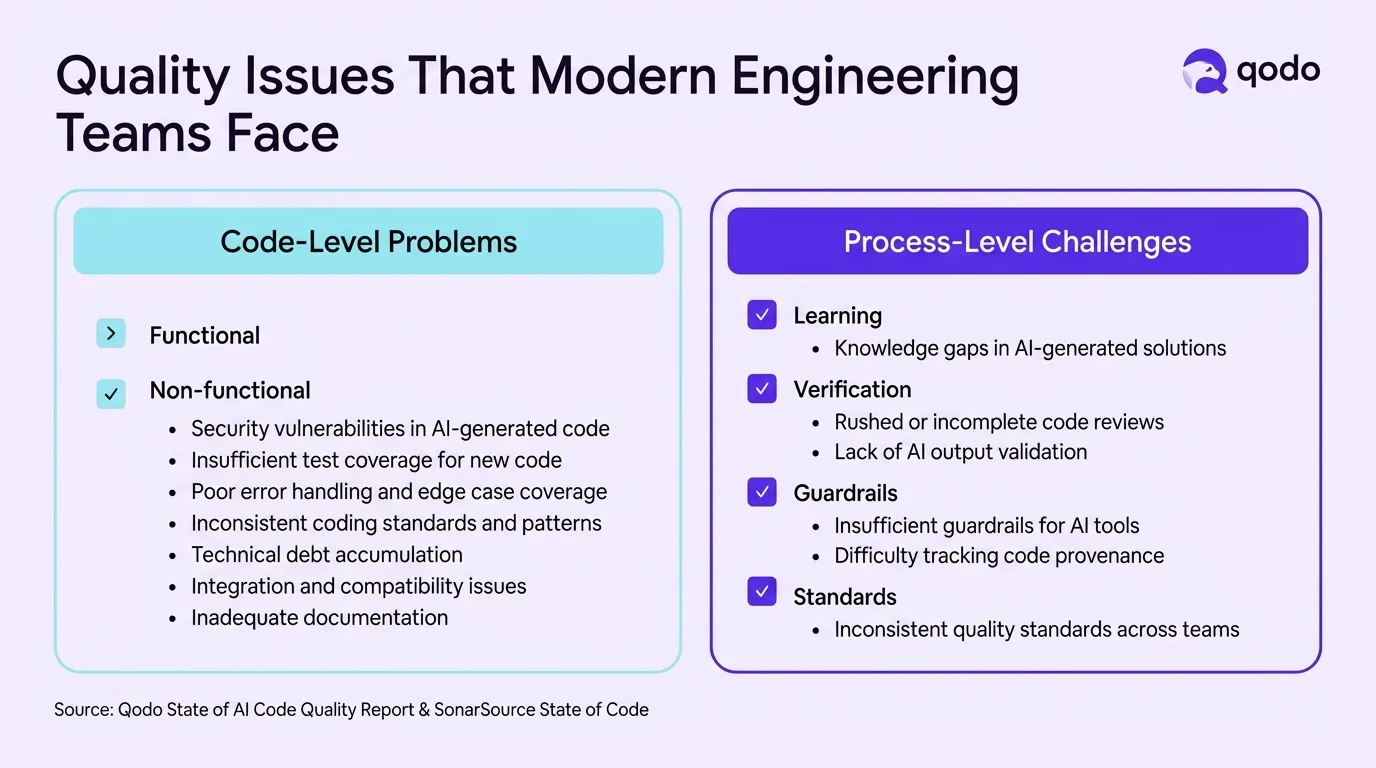 Qodo’s Context Engine pulls in logs, history, and PR comments to give models the right information at the right time. The quality issues teams face split into code-level problems (security vulnerabilities, insufficient test coverage, technical debt) and process-level challenges (learning gaps, inadequate verification, missing guardrails).