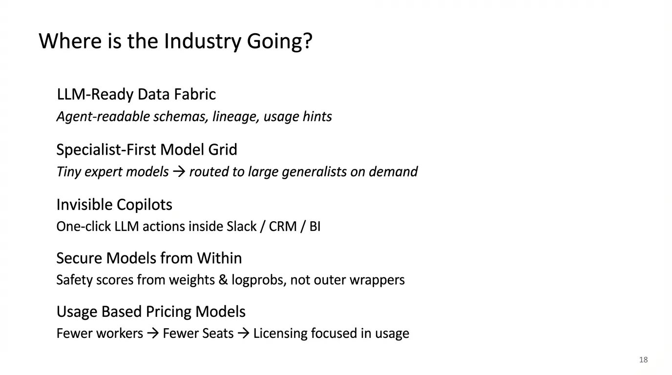 Zhang sees five industry trends emerging: LLM-ready data fabrics with agent-readable schemas and lineage. Specialist-first model grids where tiny expert models route to large generalists on demand. Invisible copilots—one-click LLM actions inside Slack, CRM, and BI tools. Security built into models from within, not outer wrappers. And usage-based pricing: fewer workers means fewer seats means licensing focused on usage.