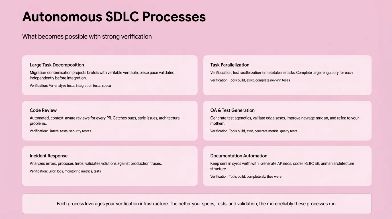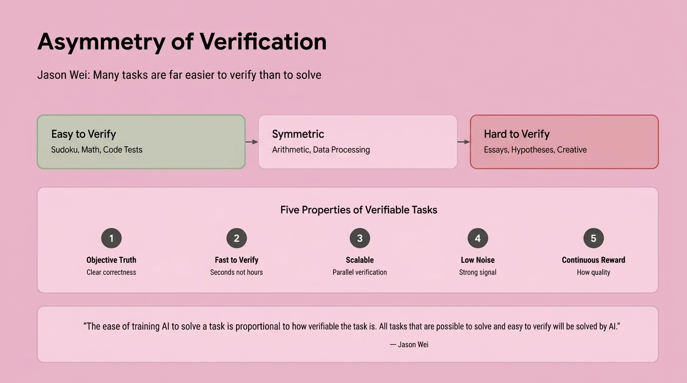 Reyes: “Many tasks are much easier to verify than to solve.” Verifiability is the key constraint on AI capability. “The ability to solve is proportional to how verifiable it is for the AI to solve.” Focus engineering efforts on creating rigorous verification boundaries, not micromanaging the process.