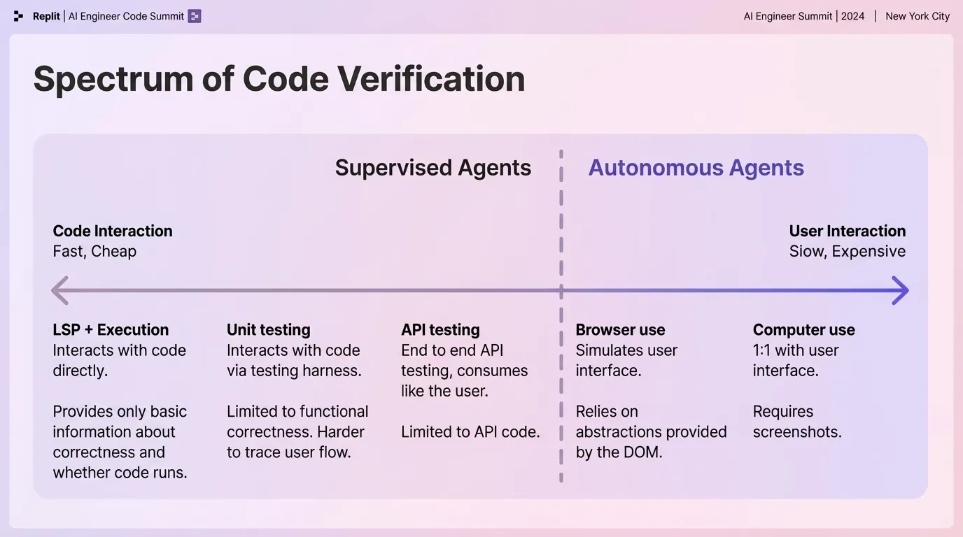 Catasta presents a spectrum of code verification—from fast/cheap code-level testing (LSP, unit tests) to slow/expensive user-interface testing (browser use, computer use). The tradeoff between supervision level and resource requirements shapes how you architect autonomous agents.