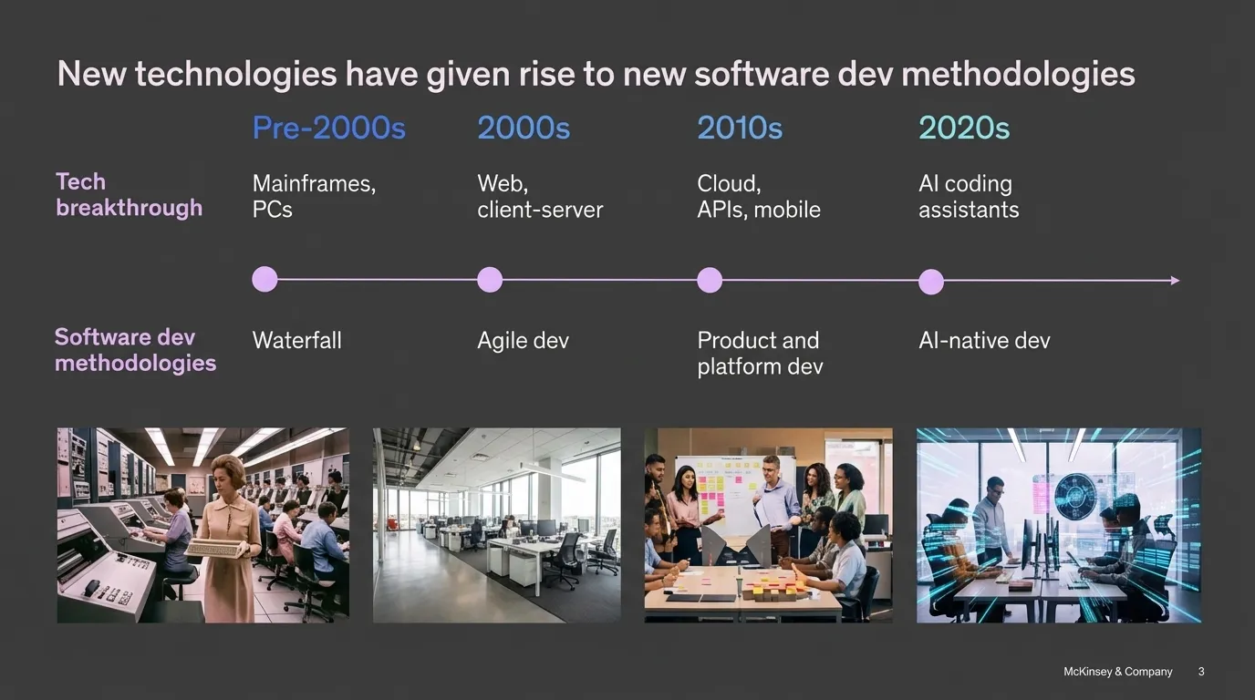 New technologies have always driven new development methodologies. Mainframes gave us waterfall. Web and client-server brought agile. Cloud and APIs enabled product and platform development. Now AI coding assistants are driving “AI-native dev”—the next evolution.