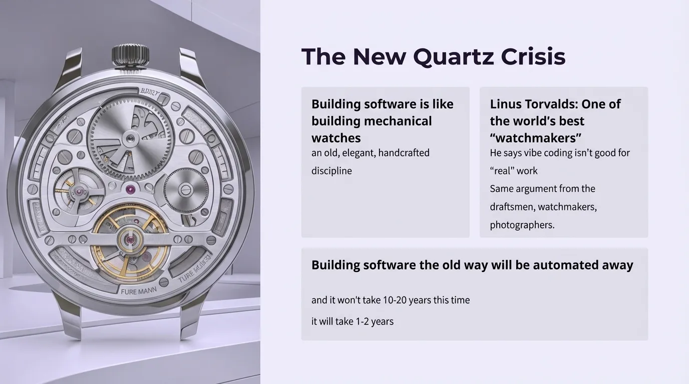 The resistance patterns keep repeating. Steve Yegge compared it to the Quartz Crisis that disrupted Swiss watchmaking: “Building software is like building mechanical watches: an old, elegant, handcrafted discipline.” Linus Torvalds says vibe coding isn’t good for “real” work—same argument from draftsmen, watchmakers, photographers. “Building software the old way will be automated away—and it won’t take 10-20 years this time. It will take 1-2 years.”
