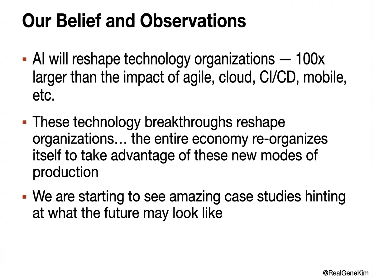Gene Kim opened with a striking claim: “AI will reshape technology organizations—100x larger than the impact of agile, cloud, CI/CD, mobile, etc.” The entire economy re-organizes itself around new modes of production. We’re starting to see the case studies.