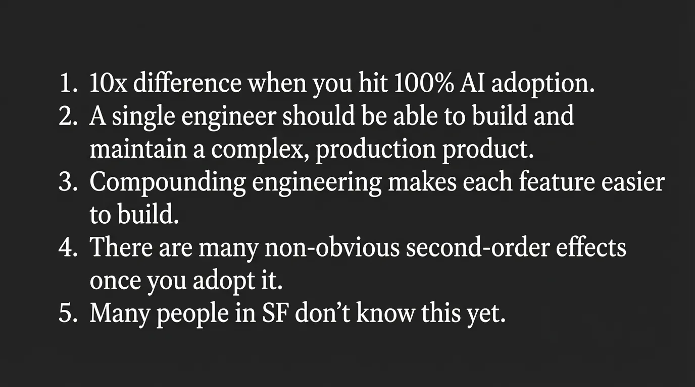 Reock’s predictions for full AI adoption: 10x productivity difference. A single engineer building and maintaining complex production products. Compounding engineering where each feature makes the next easier. “Many people in SF don’t know this yet.”