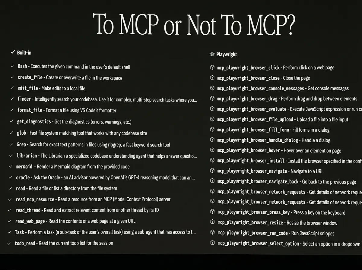 Key Point: Amp uses a hybrid approach, combining built-in custom tools for core coding functionality (file operations, search, code understanding) with MCP (Model Context Protocol) for specific integrations like browser automation via Playwright.