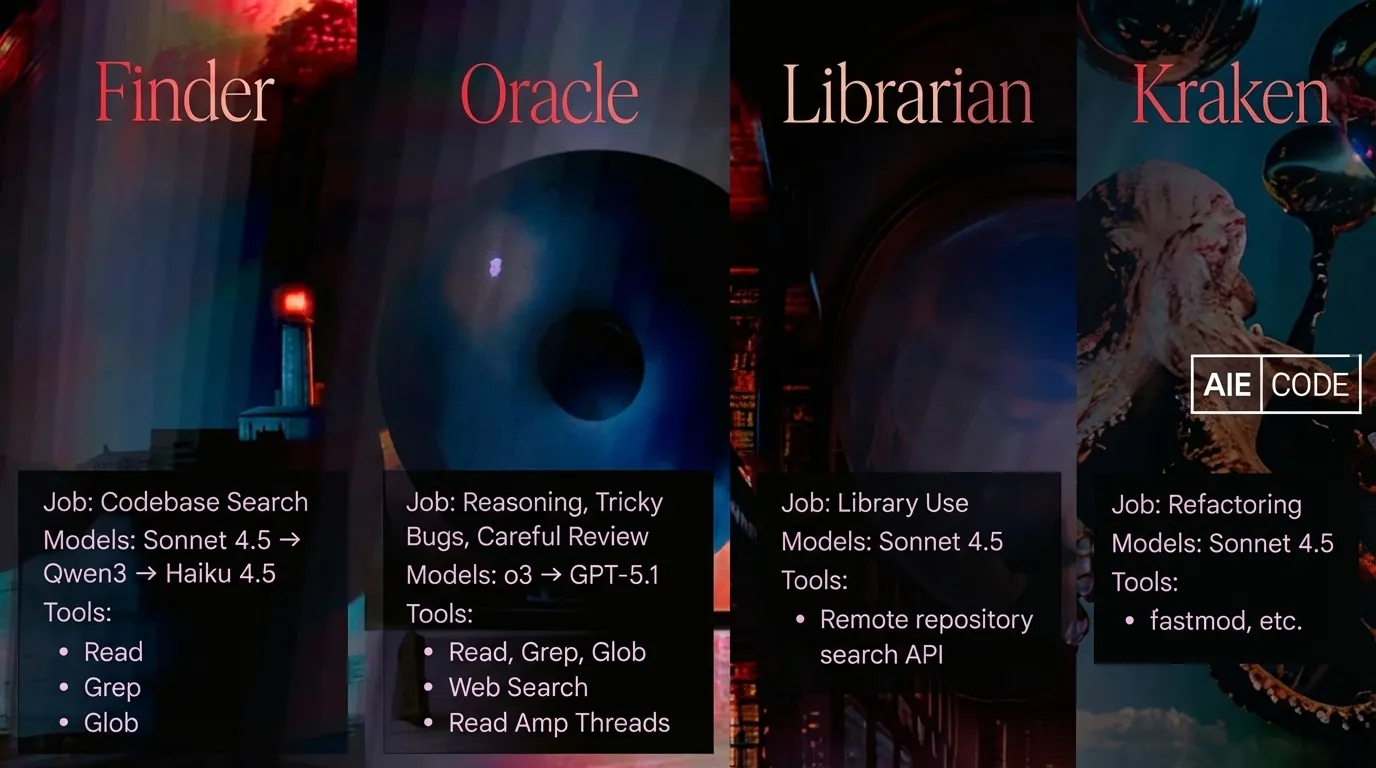 - Oracle (Job: Reasoning, Tricky Bugs, Careful Review; Models: o3 → GPT-5.1; Tools: Read, Grep, Glob, Web Search, Read Amp Threads)