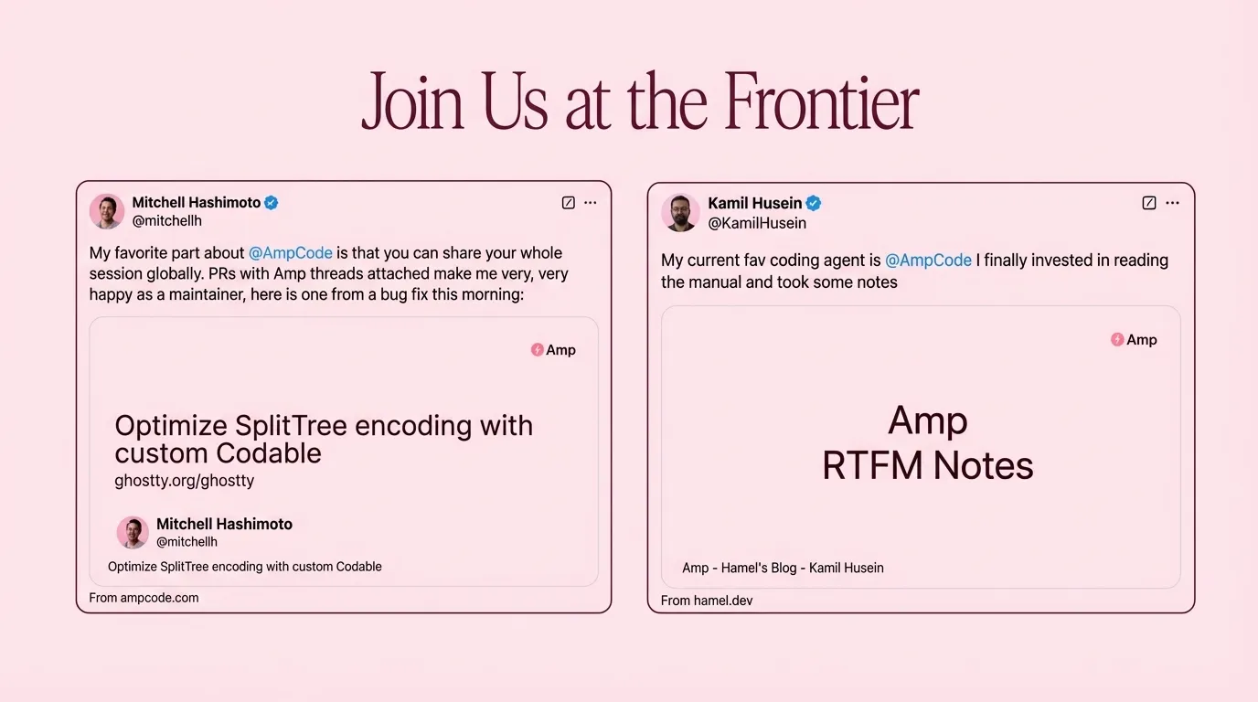 Key Point: Real users (including notable developers like Mitchell Hashimoto) are praising Amp’s unique features, particularly the ability to share session threads and its effectiveness as a coding agent. This slide provides social proof and community validation.