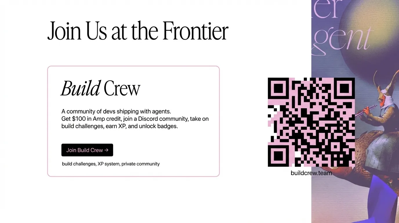 Key Point: Amp is building a developer community called “Build Crew” with incentives ($100 credit), gamification (XP, badges), and challenges to encourage adoption and engagement with their AI coding agent platform.