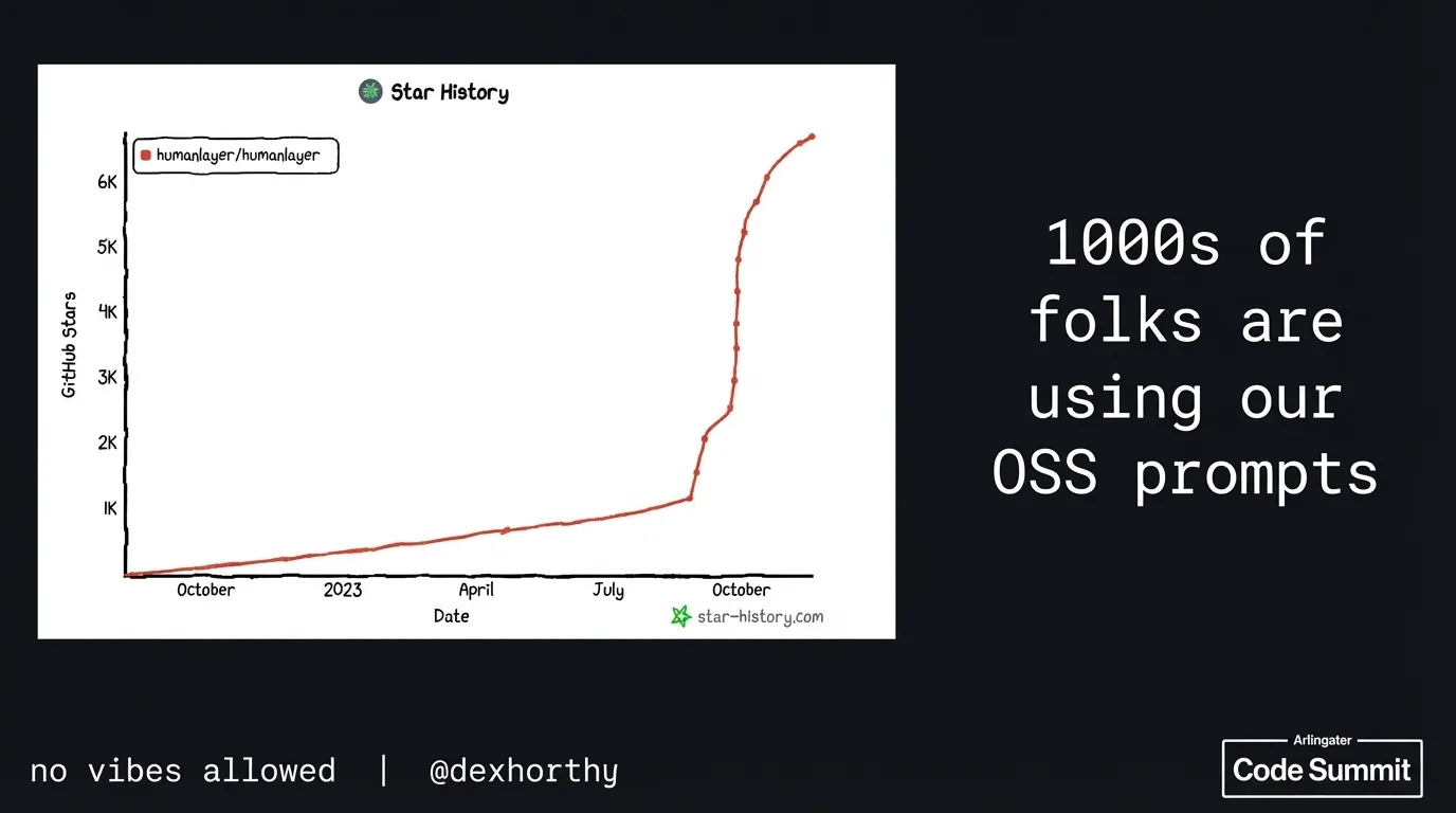 Key Point: Demonstrates the significant adoption and growth of their open-source prompt library, using GitHub stars as a metric to show thousands of users have adopted their OSS prompts over approximately one year.