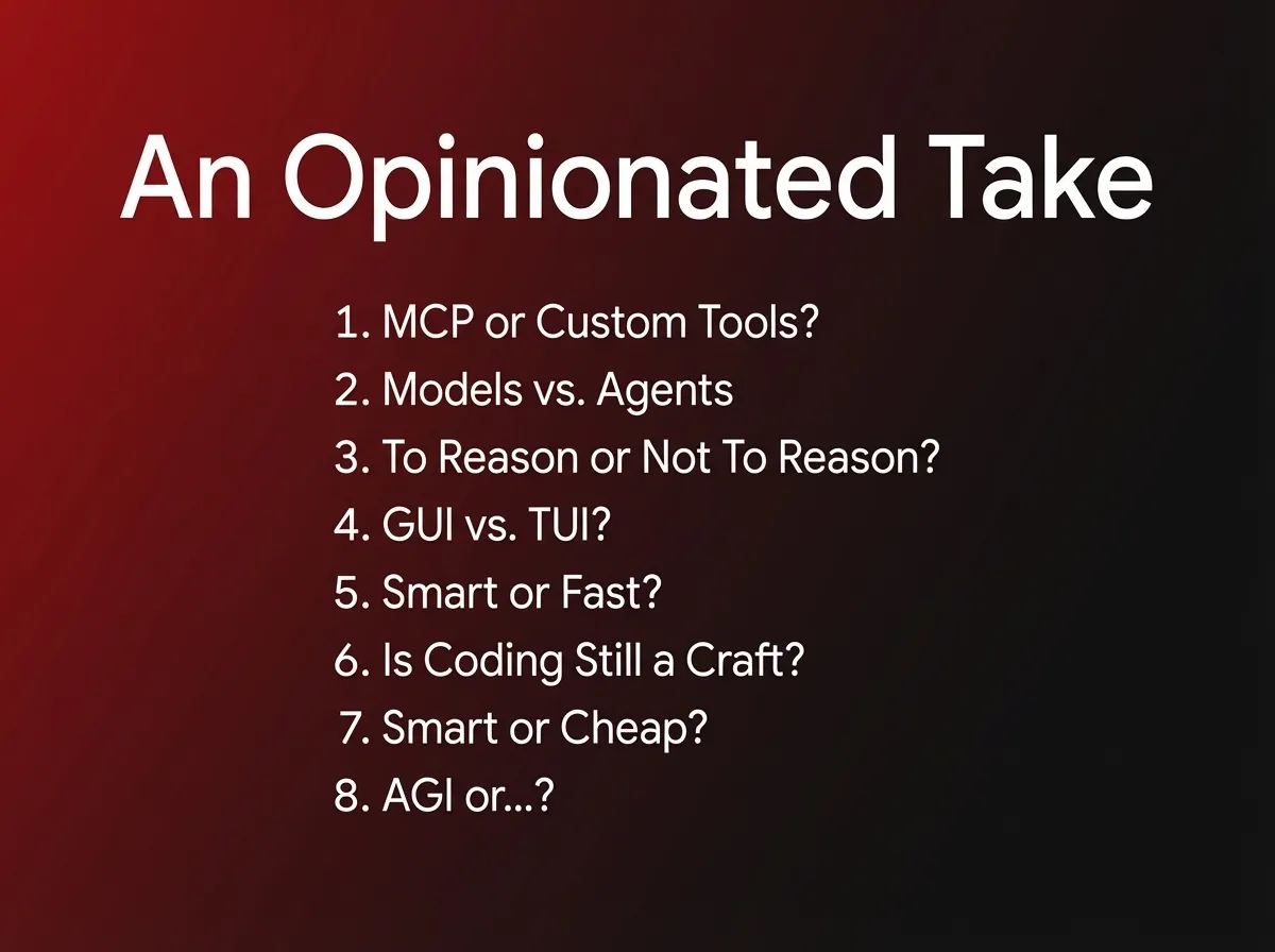 Key Point: This slide presents the key architectural and philosophical questions/decisions that Amp made in building their coding agent. These represent fundamental trade-offs in AI agent design.