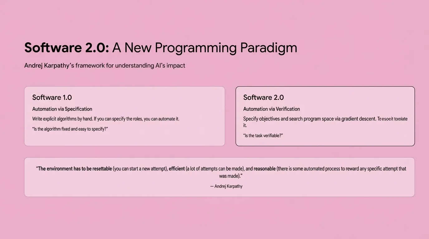 Key Point: Explains the fundamental paradigm shift from Software 1.0 (writing explicit algorithms) to Software 2.0 (defining objectives and letting AI find solutions through verification). The key question changes from “can we specify the rules?” to “can we verify the output?”