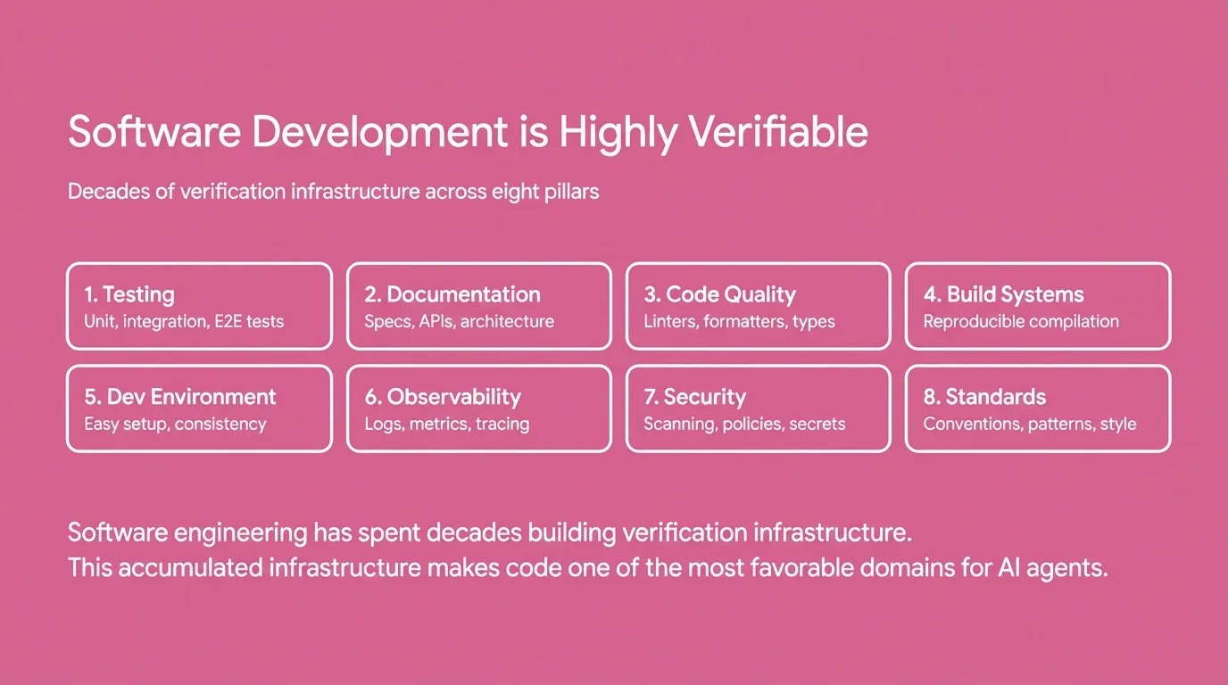 Key Point: Software development has uniquely strong verification infrastructure built over decades (testing, documentation, linters, build systems, etc.), making it exceptionally well-suited for AI agents compared to other domains.