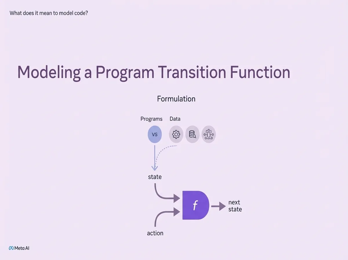 Key Point: Explains the theoretical foundation of code modeling as a state transition function - where a program takes current state and action as inputs and produces the next state, providing a mathematical framework for understanding how AI models can represent program execution.
