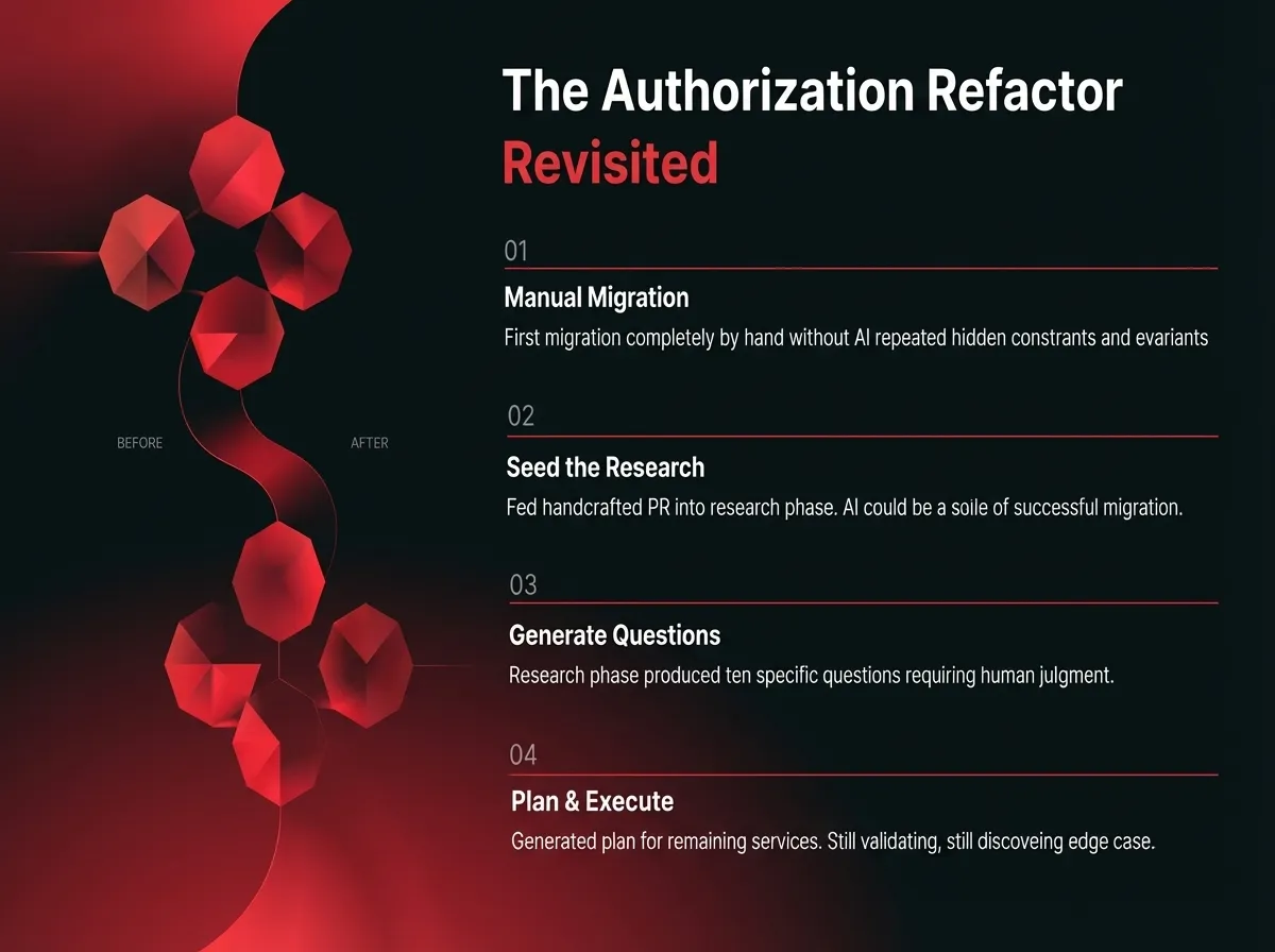 - Subtitle: “We asked AI to refactor old, tightly coupled authorization code to use our new centralized system.”