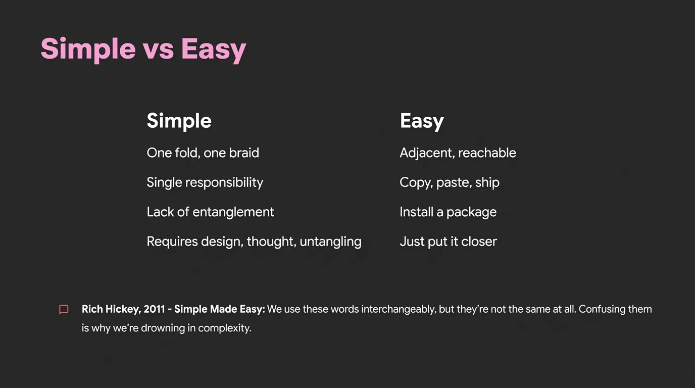 - Bottom citation: “Rich Hickey, 2011 - Simple Made Easy: We use these words interchangeably, but they’re not the same at all. Confusing them is why we’re drowning in complexity.”